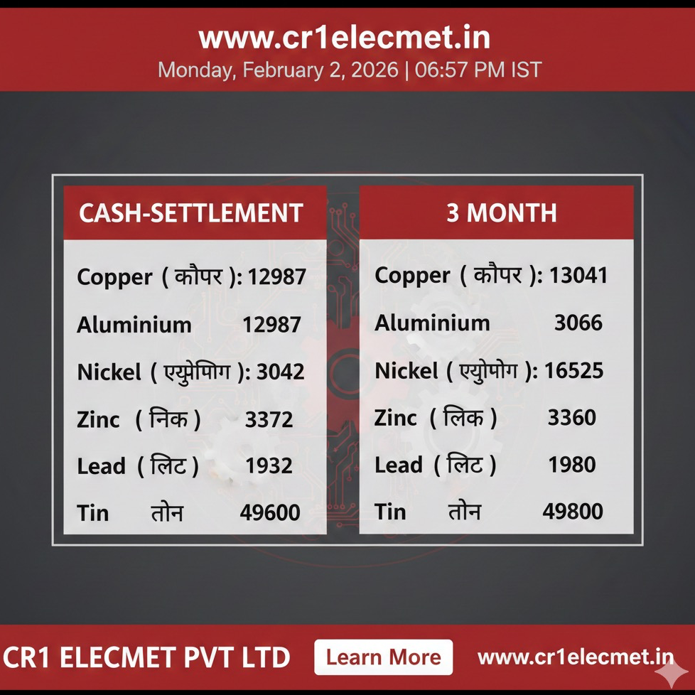 Www.cr1elecmet.in *02-Feb-26 | 06:49 PM* *Cash-Settlement* *Copper ( कॉपर )*: 12987 *Aluminium ( एल्युमीनियम )*: 3042 *Nickel ( निकेल )*: 16540 *Zinc ( जिंक )*: 3372 *Lead ( लीड )*: 1932 *Tin ( टीन )*: 49600 *3 Month* *Copper ( कॉपर )*: 13041 *Aluminium ( एल्युमीनियम )*: 3066 *Nickel ( निकेल )*: 16825 *Zinc ( जिंक )*: 3360 *Lead ( लीड )*: 1980 *Tin ( टीन )*: 49800 CR1 ELECMET PVT LTD www.cr1elecmet.in